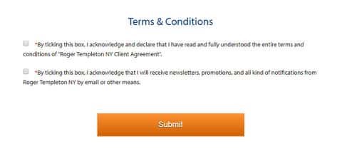 Условий сотрудничества и политики конфиденциальности лохотрон Роджер Темплтон не предоставляет, что говорит об нежелании аферистов знакомить клиента с ними. Хотя даже при регистрации аккаунта у мошенников стоит поле для подтверждение согласия с клиентским соглашением шулеров, на которое у аферистов Roger Templeton NY на сайте никаких ссылок нету.