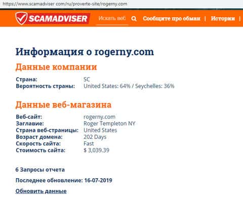В связи с мошеннической и противозаконной деятельностью шулеров Роджер Темплтон его руководители предпочитают анонимность дабы избежать ответственности со стороны правоохранительных органов. Информацию о самом же сайте лохотрона Roger Templeton NY можно узнать непосредственно с помощью портала scamadviser com, которую вы можете увидеть ниже.