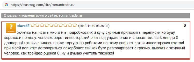 На информационном сайте трусторг ком был замечен комментарий о скам-конторе RomanTrade Ru. Автор данного отзыва пишет о том, как мошенники сливают денежные средства со счетов клиента и разговаривает с пользователями угрожая им. Связываться с сомнительным проектом Роман Трейд не рекомендуем !!!