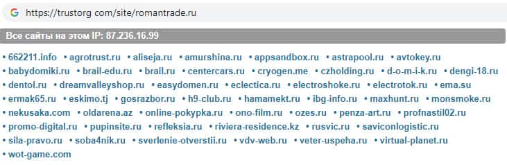 На информационном сайте trustorg com была произведена проверка ip-адреса жульнической организации Роман Трейд. Выяснилось, что сайт данной скам-организации находится по соседству с сайтами, которые не имеют никакого отношения к рынку Форекс, а именно с новостными веб-порталами и интернет-магазинами.