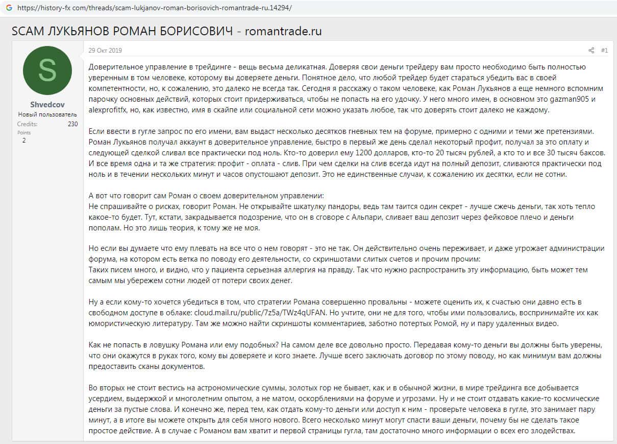 На веб-портале history-fx com отыскан отзыв о мошенническом проекте Роман Трейд, который рассчитан на новичков. Жулики зарабатывают вовлекая людей в торговлю на сайтах скам-брокеров, на сайтах которых можно не только слить все свои денежные средства, но еще и набраться кредитов.