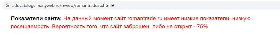 На веб-сервисе addcatalogs manyweb ru обнаружена информация о жульнической конторе RomanTrade Ru. Оказалось, что на данный момент интернет-сервис Роман Трейд имеет достаточно низкие показатели и низкую посещаемость. Из этого следует вывод о том, что сайт либо заброшен, либо же не пользуется популярностью среди пользователей.