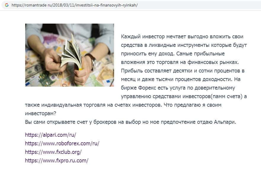 Что пишут аферисты RomanTrade Ru об инвестициях на финансовых рынках?
