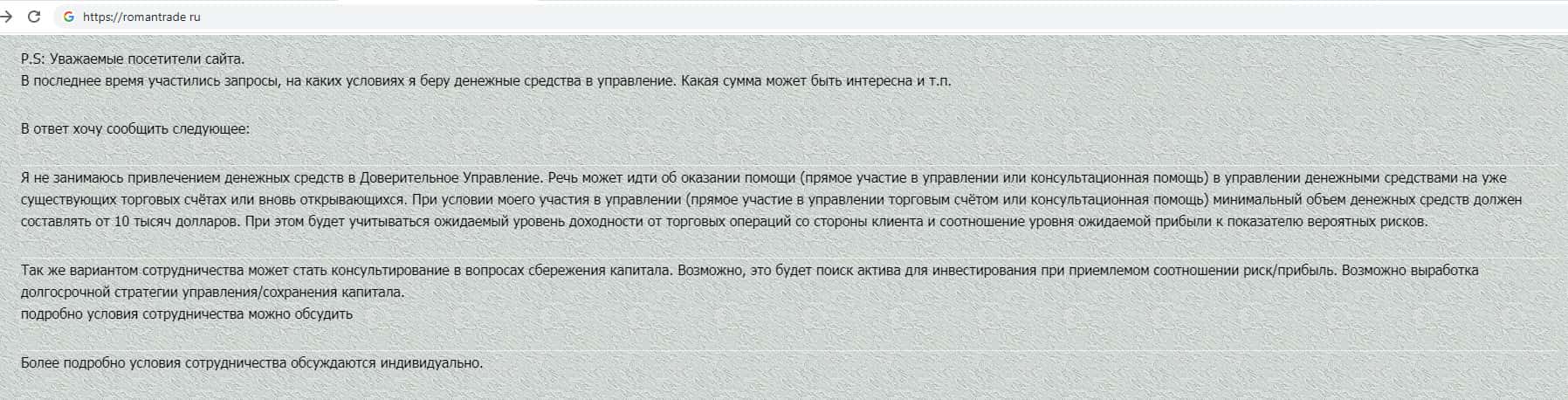 На официальном интернет-портале жульнической конторы RomanTrade Ru указана информация о том, что представитель данной шараги занимается привлечением денежных средств в доверительное управление. После чего мошенник пишет то, что якобы имеет ввиду консультации, которые предоставляет. Но как мы знаем: первое слово дороже второго.