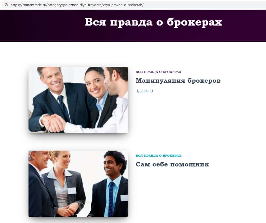 Мошенники RomanTrade Ru предлагают ознакомиться с информацией о псевдо-брокерских организациях. Здесь жулики пишут всю правду о конторах, которые занимаются выкачкой денег со своих клиентов. Эти статьи о скам-брокерах опубликованы специально для того, чтобы казаться честным на фоне этой информации.