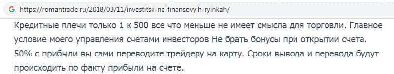 Шулера RomanTrade Ru здесь пишут о том, что гораздо выгоднее не брать кредит, а отдавать 50% прибыли трейдеру, который будет за Вас работать. Это является очередным подтверждением того, что данная контора забирает себе ровно половину от прибыли клиента в результате торговли на сайтах скам-брокеров.