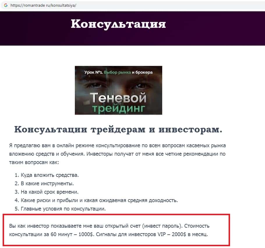 - Мошенники Роман Трейд предлагают консультации трейдерам и инвесторам