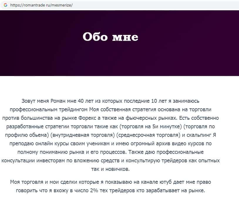- Краткая информация об авторе статьи о скам-проекте Роман Трейд