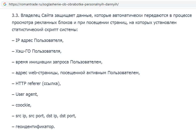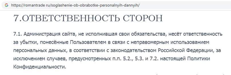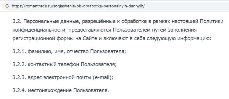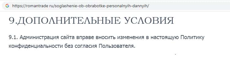 - Политика конфиденциальности на сайте скам-организации RomanTrade Ru