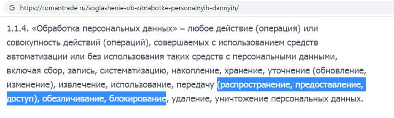 Подписав документ о политике конфиденциальности, который предоставлен конторой RomanTrade Ru клиент дает согласие на обработку персональных данных, а именно на то, что использование, передачу, удаление, уничтожение и распространение своих персональных данных. Внимательно читайте условия компании Роман Трейд, прежде чем с ними связываться.