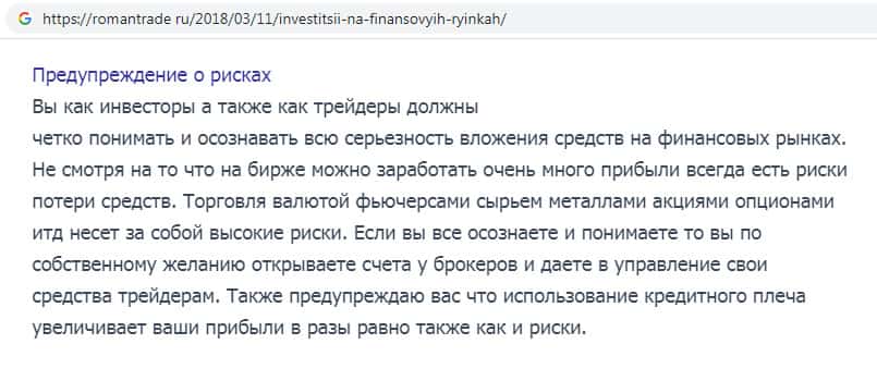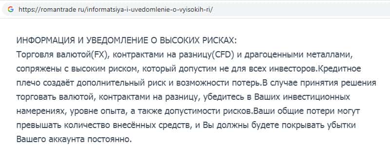 - Уведомление о всевозможных рисках потери денежных средств на сайте шараги Роман Трейд