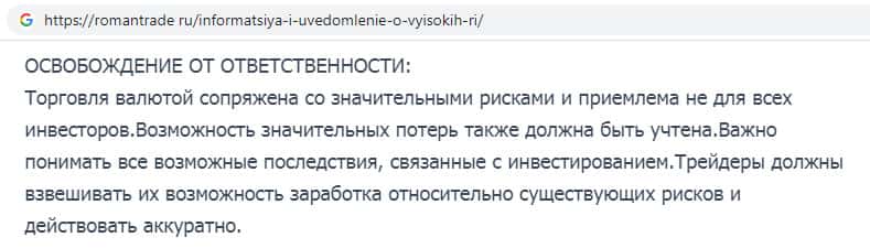 Уведомление о всевозможных рисках потери денежных средств на сайте шараги Роман Трейд