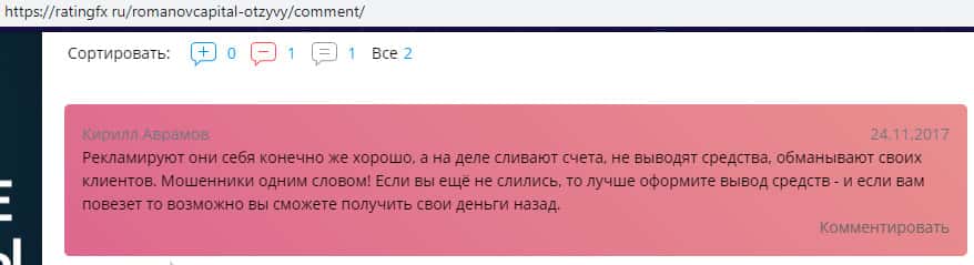 Ввиду крайне сомнительной мошеннической и противозаконной деятельности аферистов Romanov Capital на просторах сети интернет жулики Романов Капитал решили нагло слиться, однако на просторах сети интернет все же остались негативные отзывы о лохотроне Romanov Capital, что вы непосредственно можете наглядно увидеть на изображении, расположенном ниже.