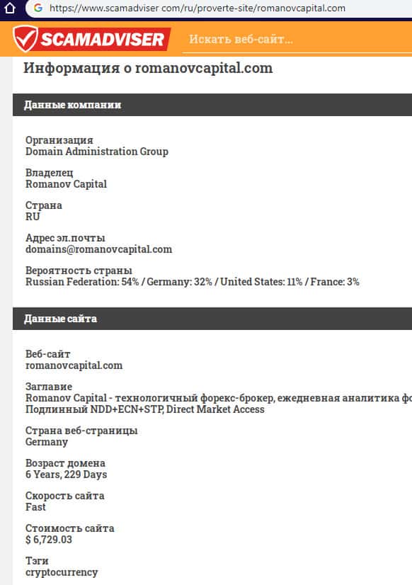Техническую же информацию о деятельности подвального сайта аферистов Романов Капитал можно узнать непосредственно с помощью веб-площадки scamadviser com, где будет предоставлена актуальная информация о сайте жуликов Romanov Capital. На изображении, расположенном ниже, вы можете наглядно увидеть информацию о сайте проходимцев.