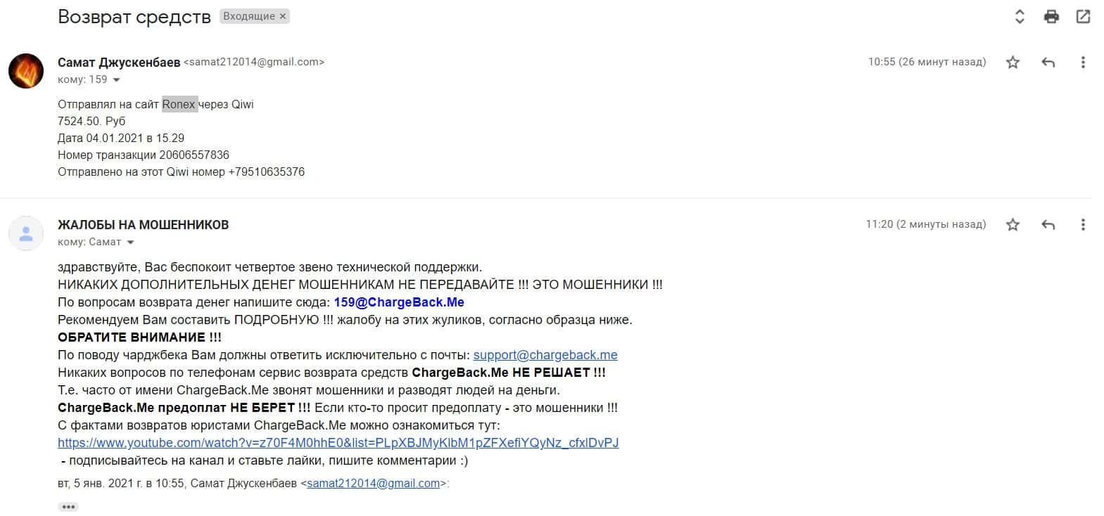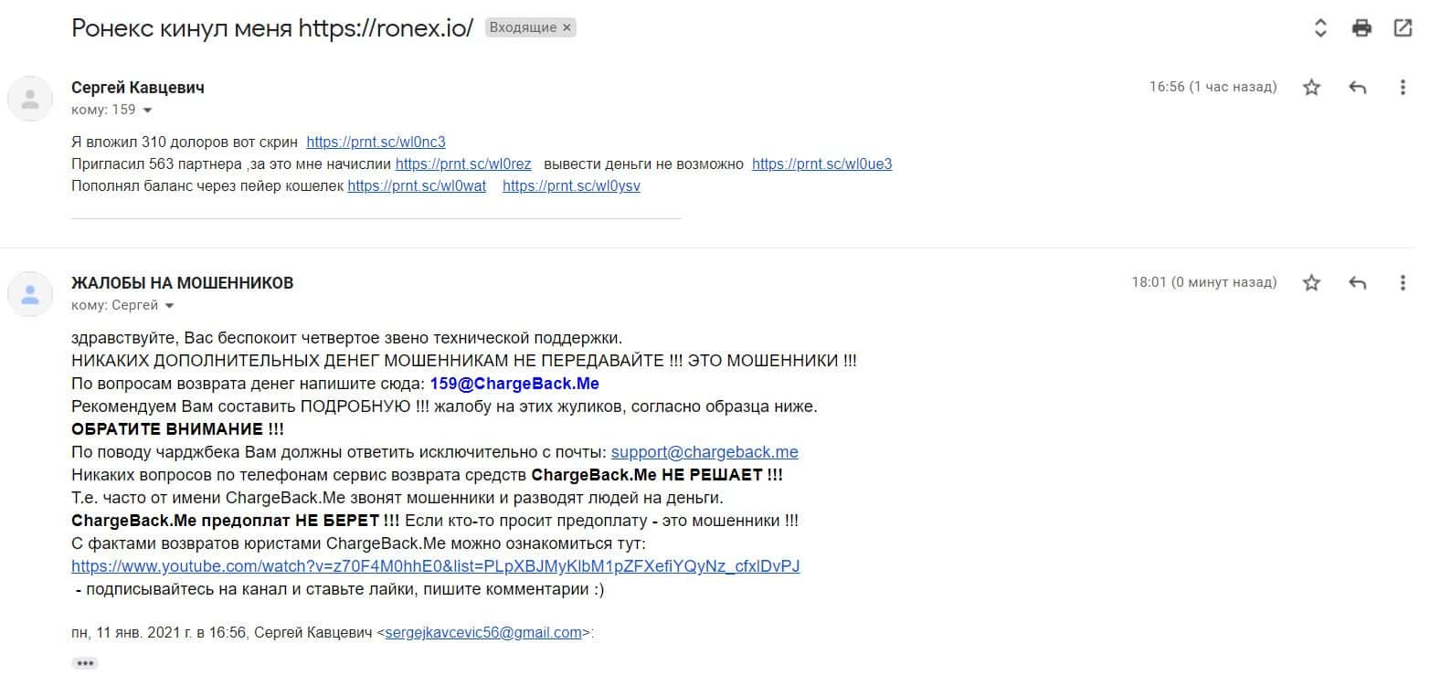 Если бесстыжие мошенники Ронекс Вас обворовали или же пытались это сделать, то в таком случае сообщите адрес электронной почты чуть далее, и мы во что бы то ни стало с Вами установим контакт по электронной почте.