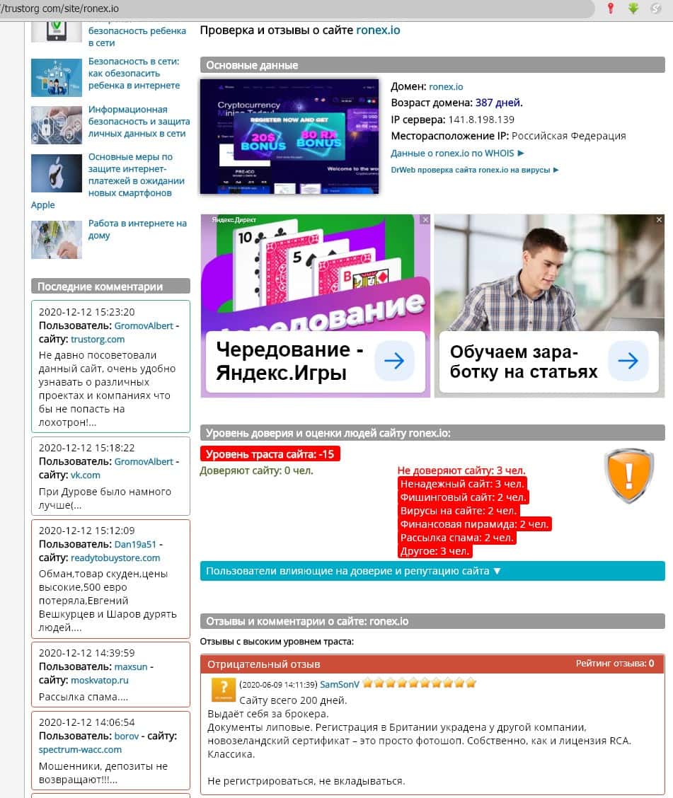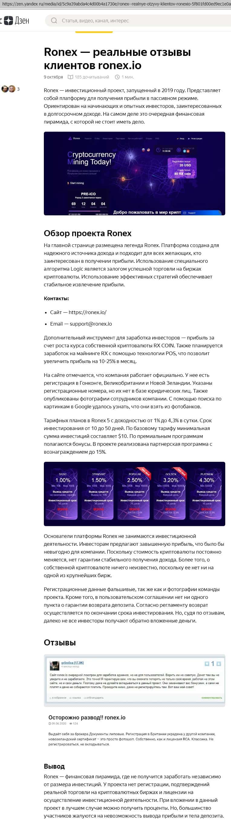 Не оставил без внимания Ронекс и Яндекс. На Яндекс.Дзен имеется статья с выводом, что Ронекс - это мошенническая платформа, ориентированная на начинающих инвесторов.