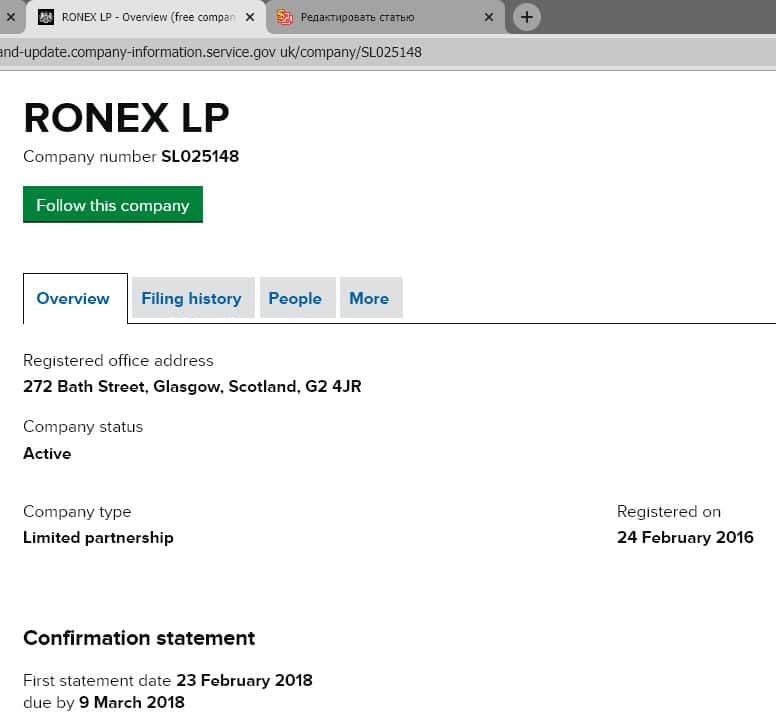 Переходя по ссылке для проверки регистрации Ронекс Лтд, попадаем в реестр юридических лиц Англии, где действительно присутствует информация об одноименной компании.