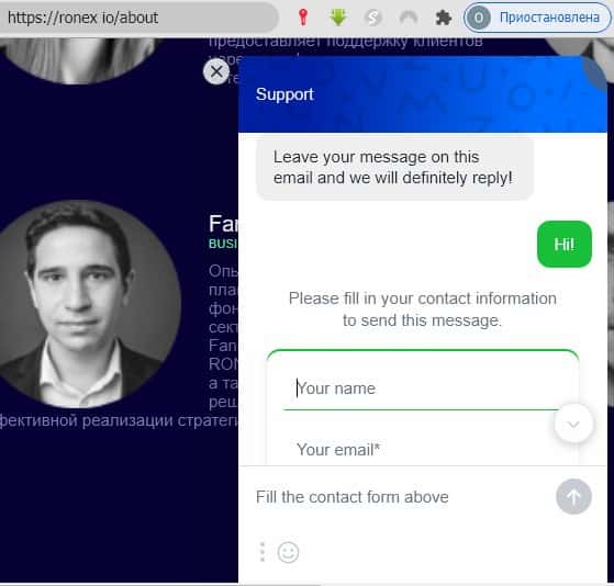 Для непосредственного общения со службой тех. поддержки Ронекс подразумевается онлайн-чат. Но все его функции сводятся к сбору контактных данных любопытствующих.