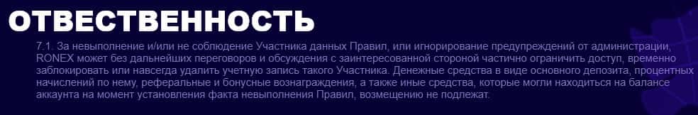 Говоря об ответственности в п. 7.1 упоминается лишь ответственность клиента. Вопрос об ответственности конторы Ронекс даже не подымается. Зато у клиента можно отнять всё.