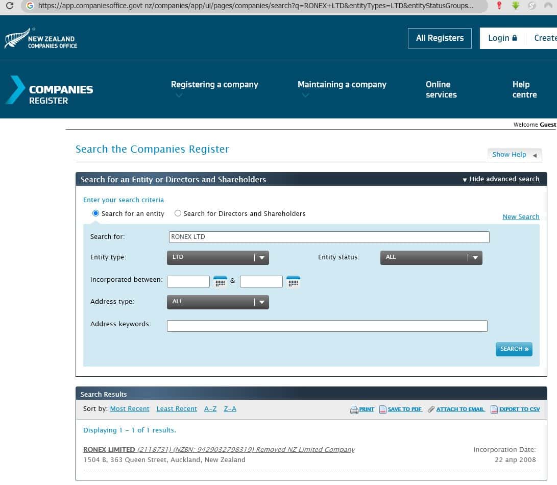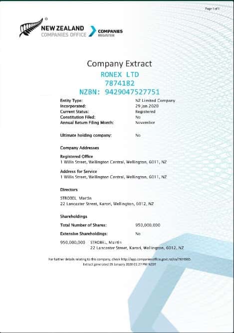 С английской регистрацией компании Ронекс разобрались выше. Рассмотрим другие лицензии, а именно свидетельство о регистрации компании Ronex Ltd в Новой Зеландии.