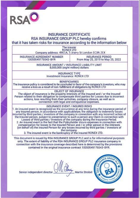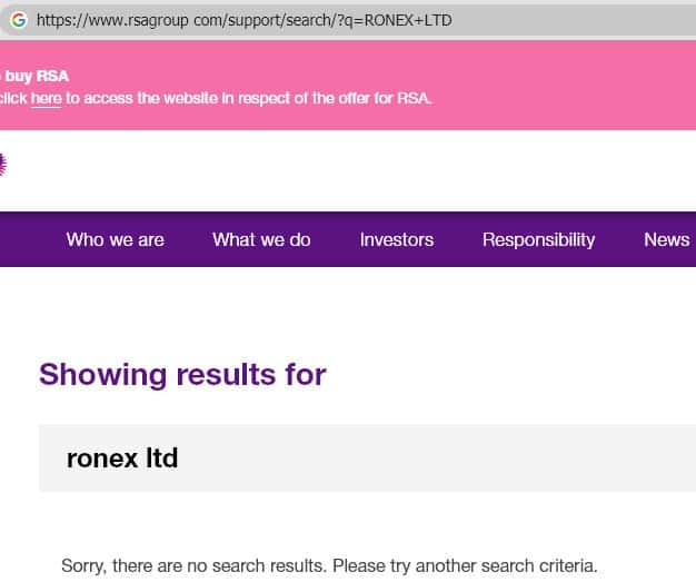 Однако, проверка этого сертификата на портале самой RSA Insurance Group PLC показывает, полное отсутствие страхования компании Ронекс и вкладов её инвесторов.