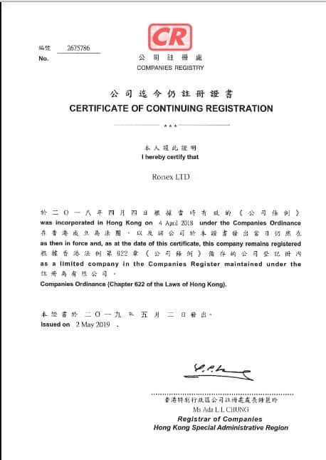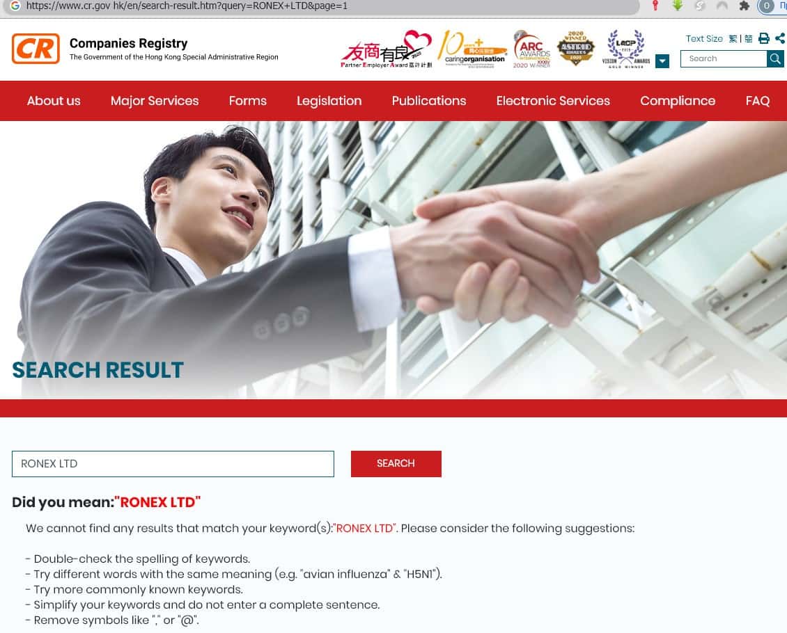 Расширяя географию деятельности своей фирмы, мошенники Ронекс представляют регистрационные данные компании Ronex Ltd. в Гонконге.