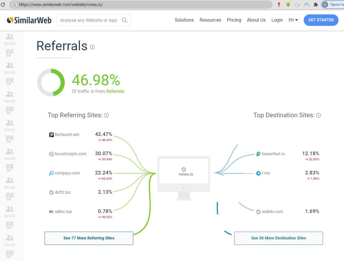 Около половины трафика портала Ронекс приходится на прямые ссылки, немного меньше на переходы по реферальным ссылкам с других криптовалютных проектов.