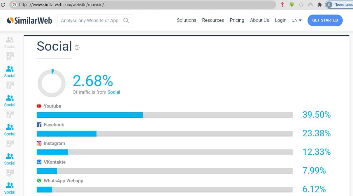 Немаловажную роль в популярности этого мошеннического проекта играет реклама в социальных сетях и главным образом в YouTube: 2,7% трафика сайта происходит из соц.сетей.