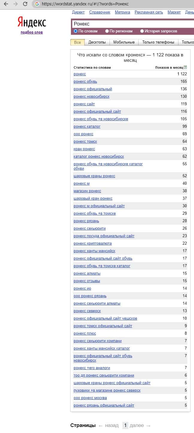 - Анализ количества поисковых запросов по бренду Ронекс в Яндекс Вордстат