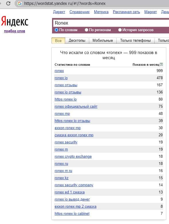 Высокие показатели поиска бренда "Ронекс" в системе Яндекс обусловлены не столько популярностью криптолохотрона, сколько его созвучностью с производителем обуви Ронекс.