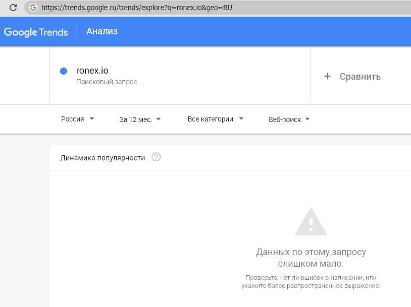 Поиск сайта мошеннической конторы "ronex.io" особо никого не интересует, судя по данным Google Trends. Здесь уже отсутствуют всплески популярности, здесь - полный штиль.