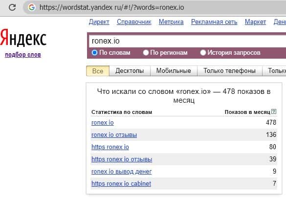 А вот количество поисковых запросов портала криптовалюного махинатора "ronex.io" падает вдвое по сравнению с предыдущими запросами в поисковой системе Яндекса в течение месяца.