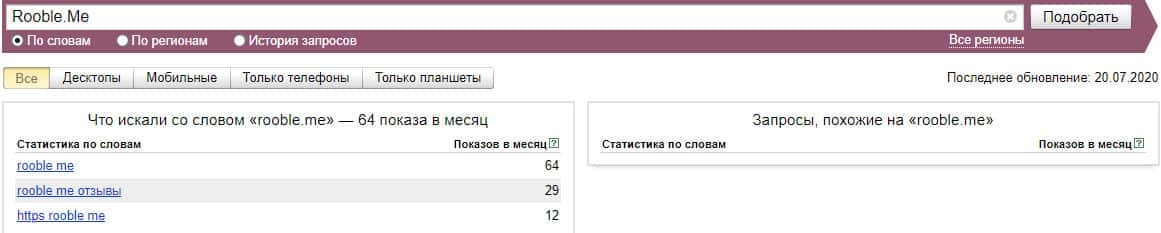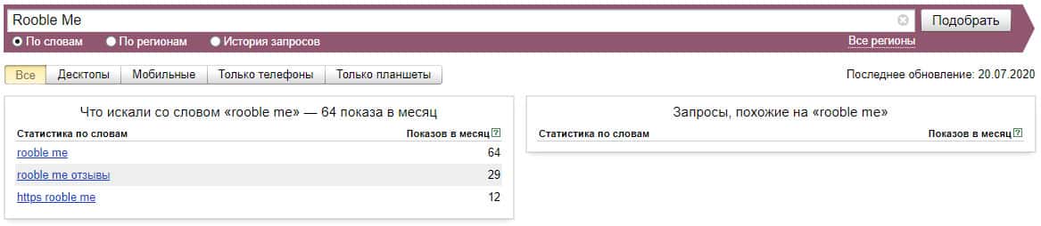 Та же ситуация и с брендом самого сайта "rooble.me" где такие же показатели. Контора Рообле Ми не популярна, так как является очередной шарагой-однодневкой.