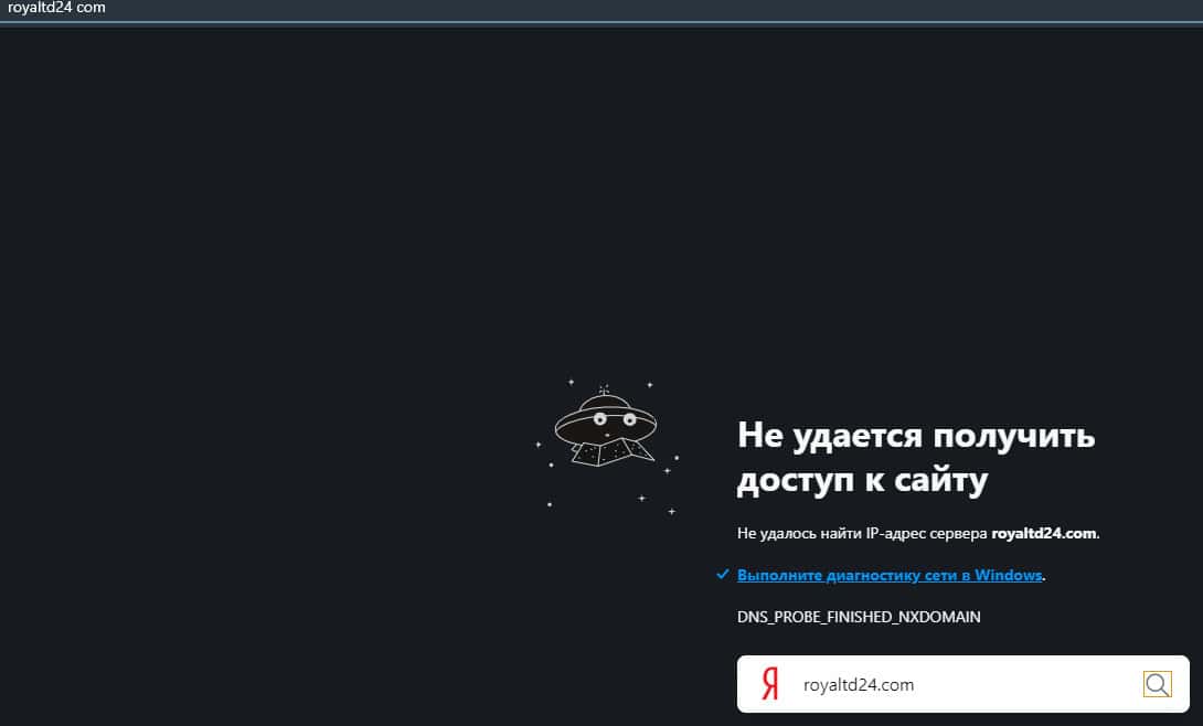В связи с крайне не успешной мошеннической и противозаконной деятельностью шулеров Роя Лтд 24 на просторах сети интернет аферисты RoyaLtd24 приняли вполне логичное решение, а именно жулики Роя Лтд 24 попросту удалили свой подвальный сайт. На изображении, расположенном ниже, вы можете наглядно увидеть результат перехода на сайт шулеров RoyaLtd24.