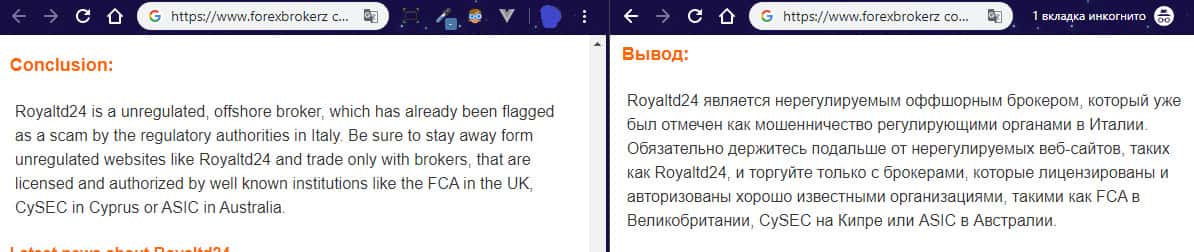 В связи с довольно наглой мошеннической и противозаконной деятельностью жуликов Роя Лтд 24 на просторах сети интернет веб-площадка forexbrokerz com посвятила данной конторе информационную статью, в которой посоветовала определенно не доверять аферистам RoyaLtd24 ввиду мошенничества, что вы можете наглядно увидеть на изображении, расположенном ниже.