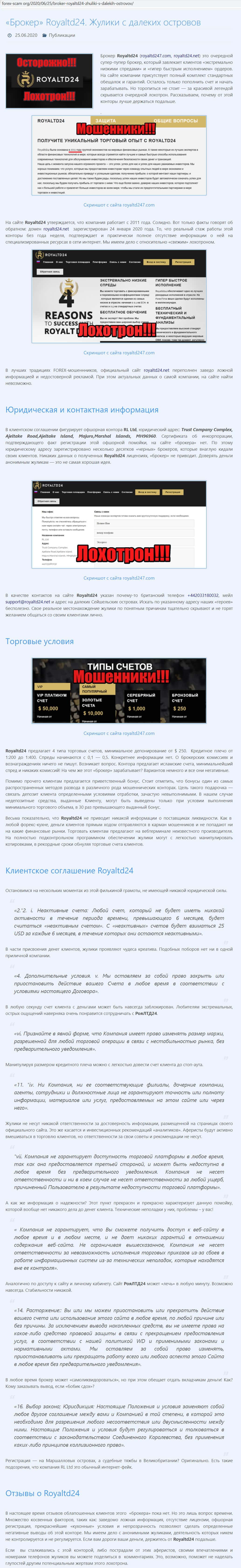 Специализированный интернет-ресурс forex-scam org опубликовал примечательный информационный материал в виде разоблачительной статьи о мошеннической брокерской компании RoyaLtd24, где детально разобрана данная скам организация, кому интересно, читаем и узнаем больше об этих аферистах Форекс.