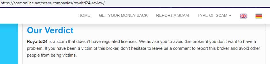 Веб-сайт скамонлайн нет так же посвятил проходимцам RoyaLtd24 статью, в которой посоветовал не иметь дело с данной мошеннической конторой так как это очередные жулики без лицензии и с крайне плохой репутацией, которые занимаются разводом пользователей на деньги. Выводы веб-площадки скамонлайн нет о жулье Роя Лтд 24 вы можете увидеть на изображении ниже.