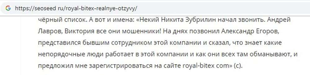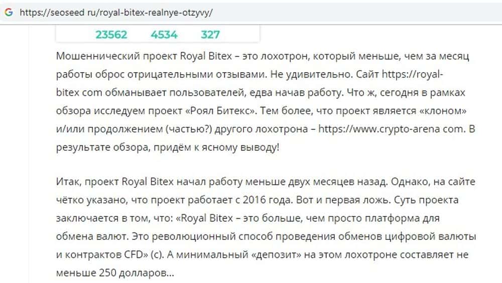 Согласно обзорам и исследованиям, которые проводят специализированные ресурсы в сети, контора Royal Bitex появилась не на пустом месте. Раньше та же группа аферистов действовала под названием crypto arena. На сайте seoseed ru подробно расписана схема развода, которую использует эта группа.