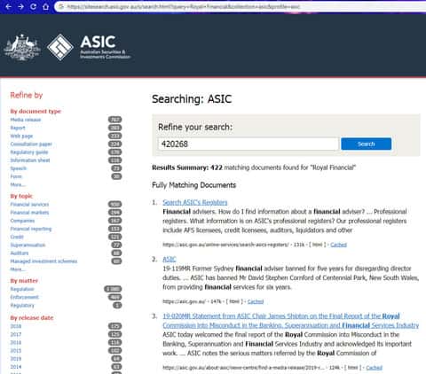 Однако при переходе на сайт указанного самими же шулерами Роял Финанс регулятора обнаружить мошенников Royal Financial в списках данного регулятора не удалось. На изображении ниже вы можете увидеть результаты поиска аферистов Роял Финанс на сайте регулятора, указанного самими же шулерами.