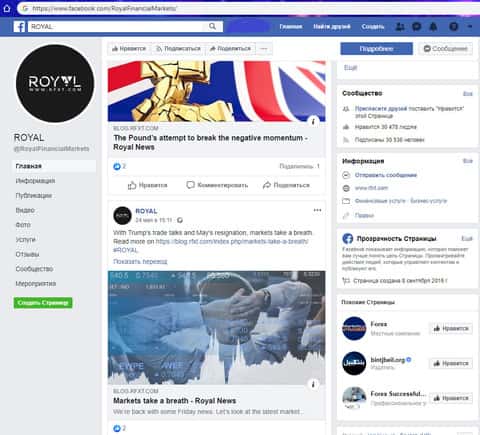 Дабы соответствовать всем современным трендам аферисты Royal Financial обзавелись страницами в социальных сетях, одной из которых стал Facebook. Именно на данной странице вы можете увидеть наглядный пример накручивания огромного количества подписчиков, которое сопровождается нулевой активностью.