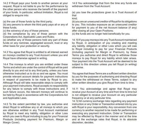 Сами же условия аферистов Роял Финанс представляют из себя воду, в ходе которой аферисты Royal Financial подписывают вас на различные соглашения, согласно которым мошенники Роял Финанс не несут ответственности за свои действия и в общем платформу.