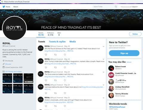 Аналогично Facebook, жулики Роял Финанс накрутили подписчиков и на страницу аферистов Royal Financial в социальной сети Твиттер, в которой у шулеров Роял Финанс так же отсутствует активность. На изображении ниже вы можете увидеть внешний вид страницы аферистов в социальной сети Twitter.