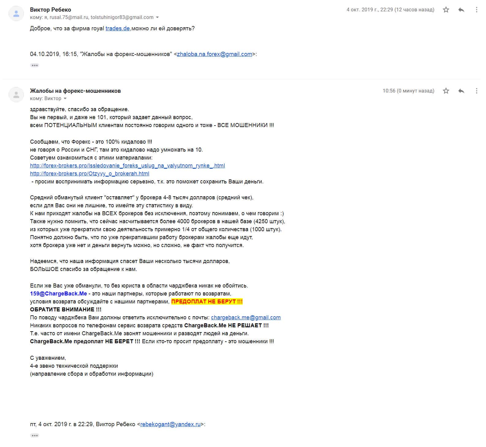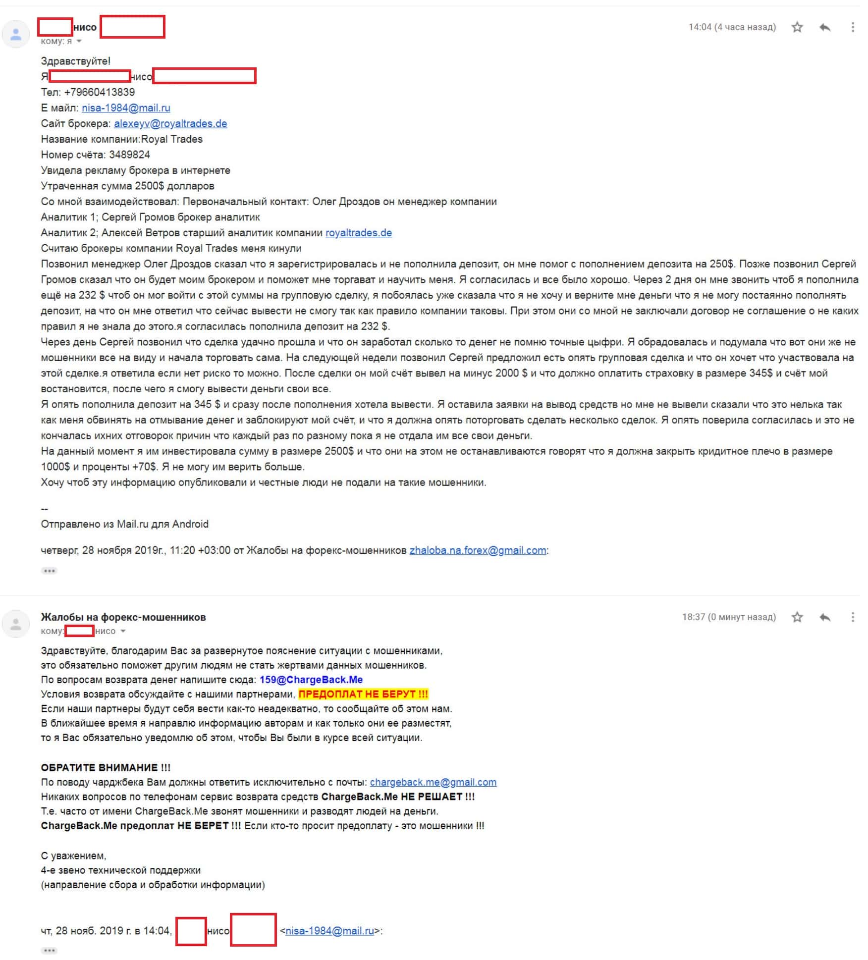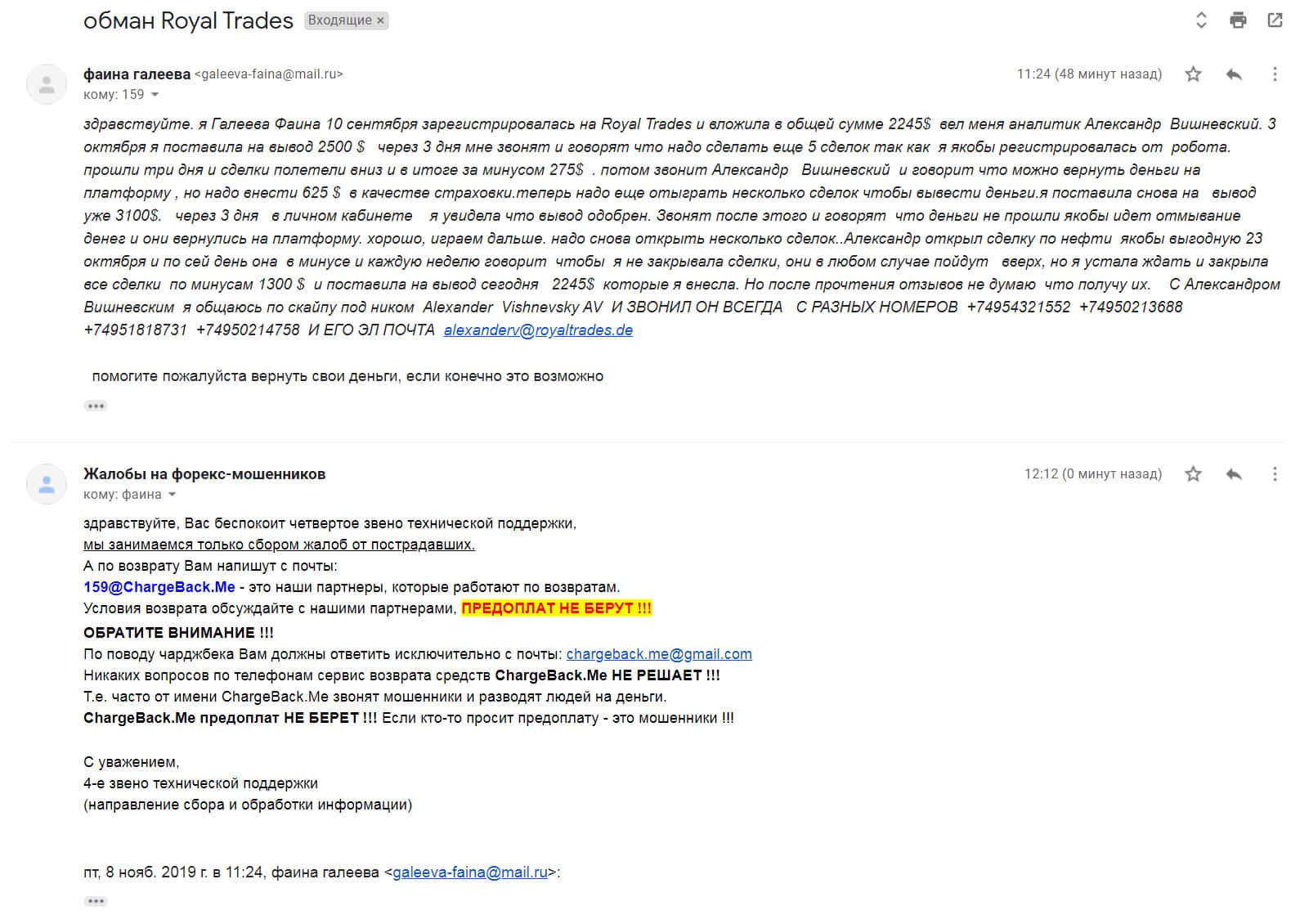Далее предлагаем ознакомится с примечательным информационным материалом о мошеннической деятельности Роял Трейдес Де в виде жалобы на данных форекс-аферистов. Письмо прислал один из пострадавших клиентов сего онлайн-лохотрона, которого кинули более чем на 2245 американских долларов.