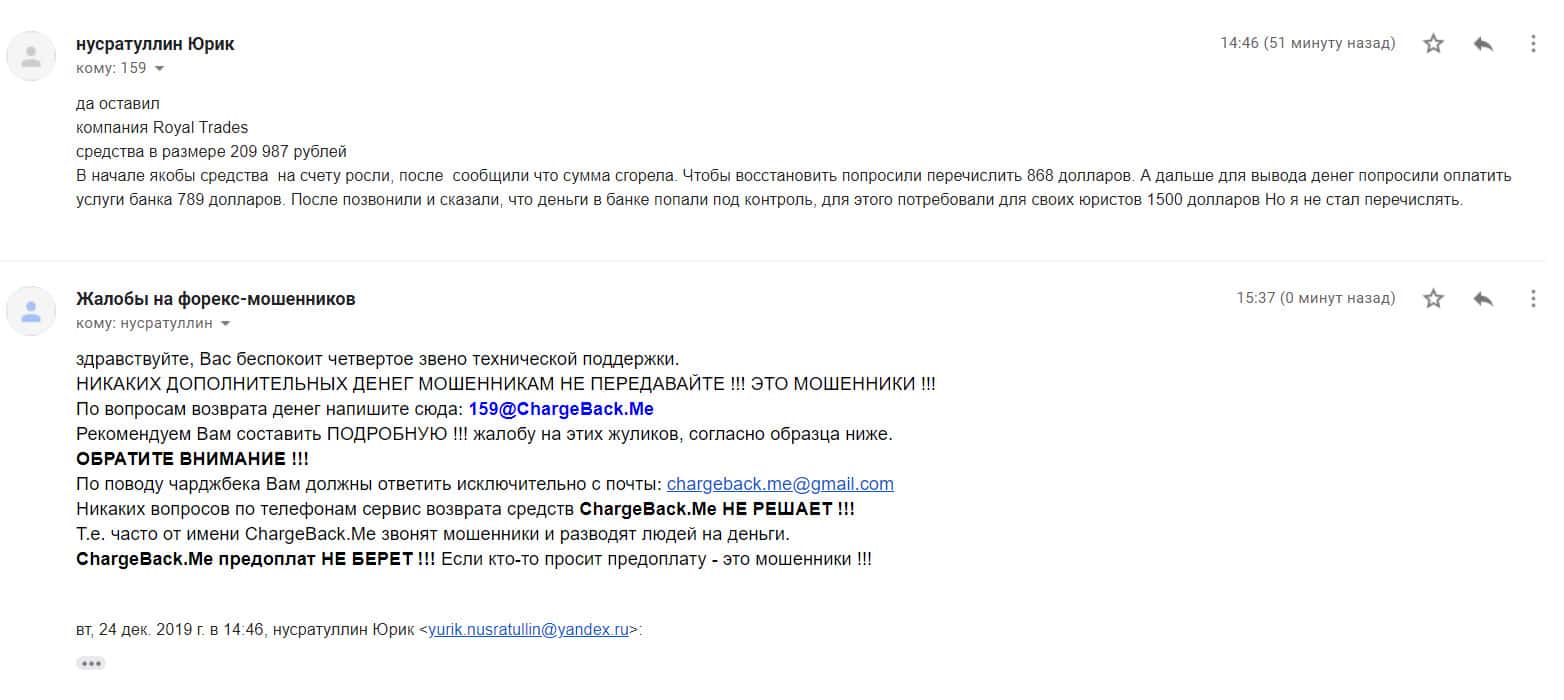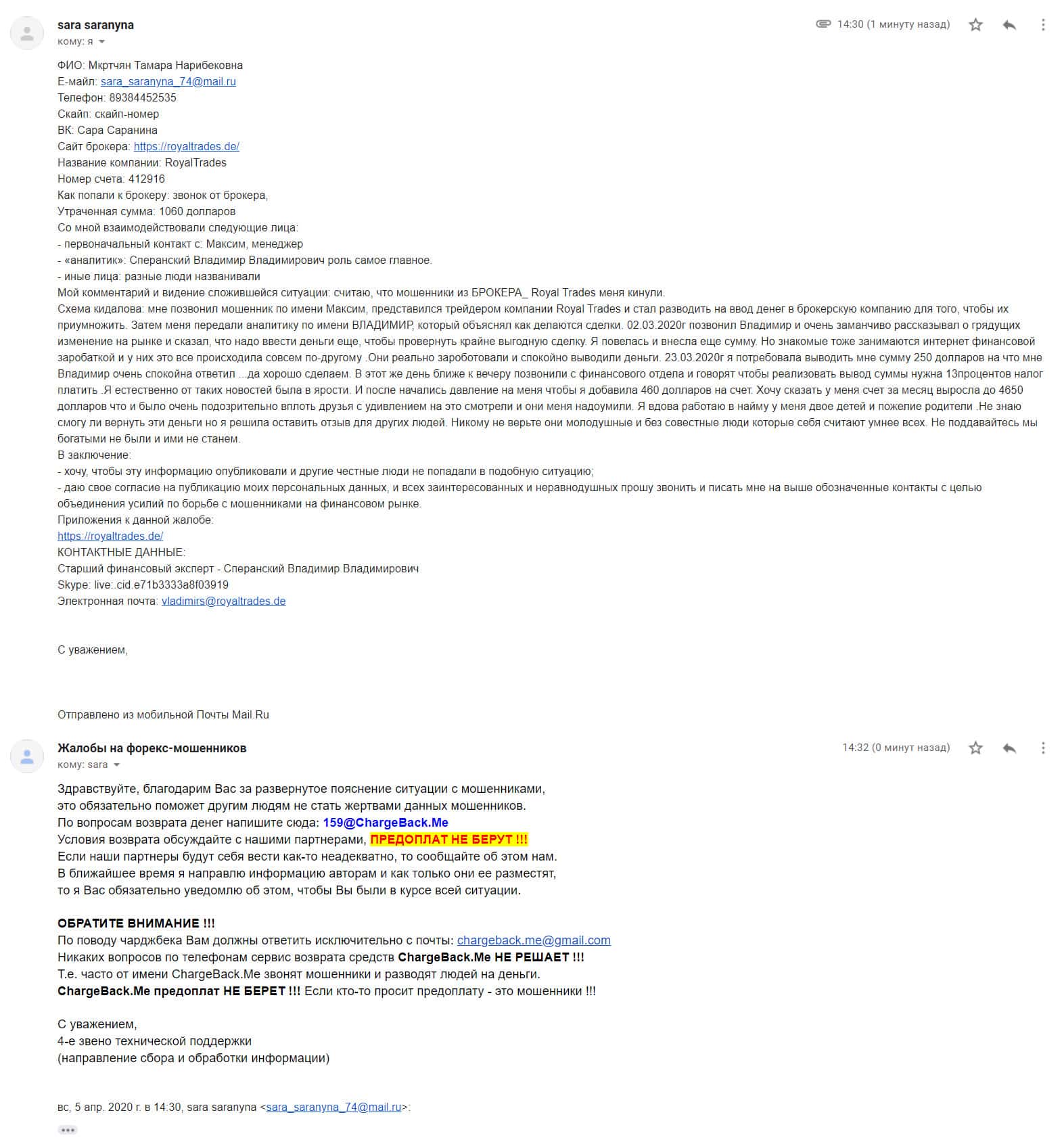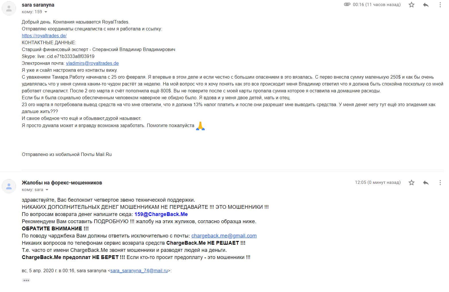 Далее предлагаем ознакомится с примечательным информационным материалом о мошеннической деятельности Роял Трейдес Де в виде жалобы на данных форекс-аферистов. Письмо прислал один из пострадавших клиентов сего онлайн-лохотрона, которого кинули более чем на 2245 американских долларов.