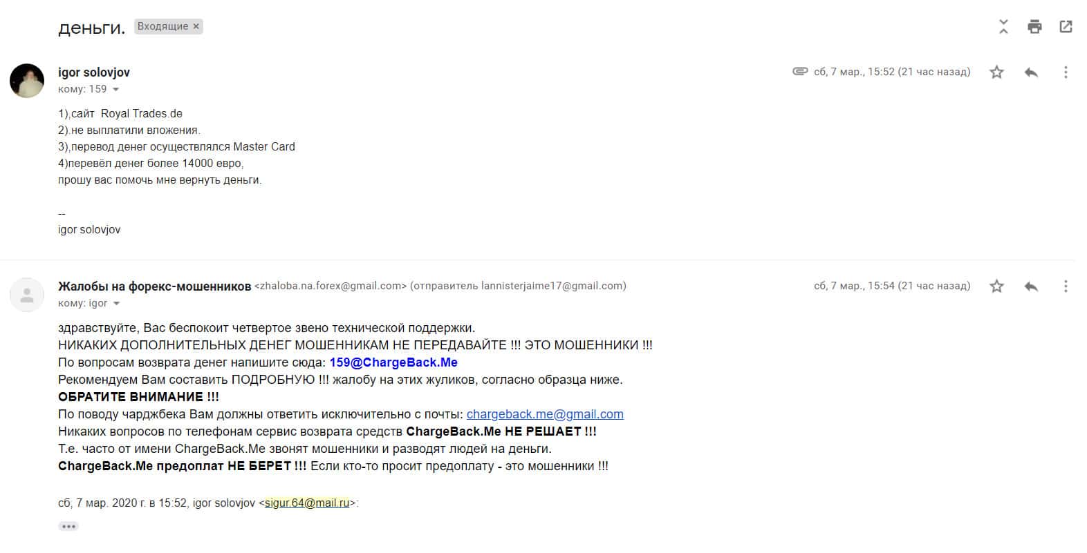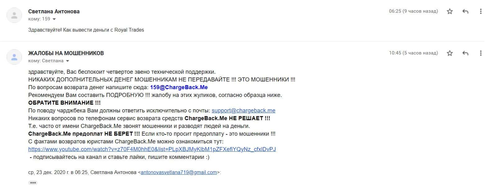 Далее представлено письмо, в котором человека чуть не обманула скам-контора RoyalTrades De. Мошенники начали предлагать своей жертве торговлю биржей, но человек отказывался. Но по итогу аферисты до сих пор пытаются заставить мужчину вложить его средства в их сайт, но парень их игнорирует.