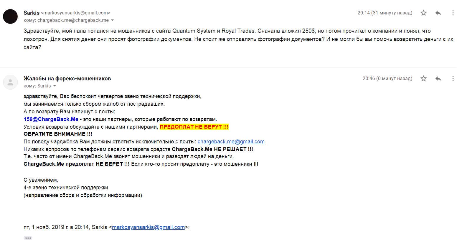 Далее представлена жалоба, в которой человек рассказывает, как его обманули сразу же две скам-организации Роял Трейдс и Quantum System. Парню предложили неплохой заработок в интернете. Клиент согласился, после чего зарегистрировался на сайте. Но когда жулики показали своё истинное лицо, пострадавший понял, что его обманули на 250 долларов.