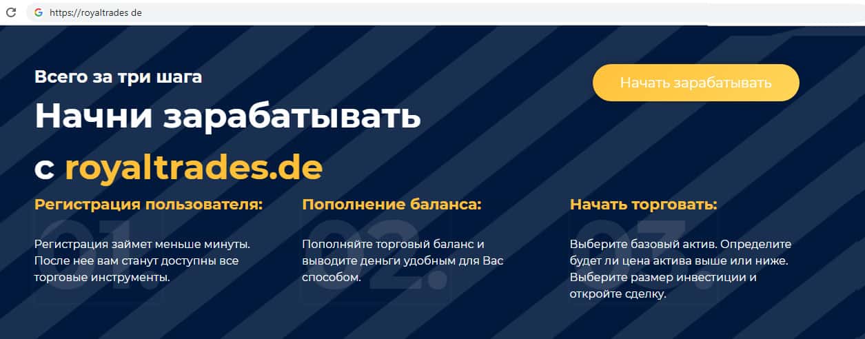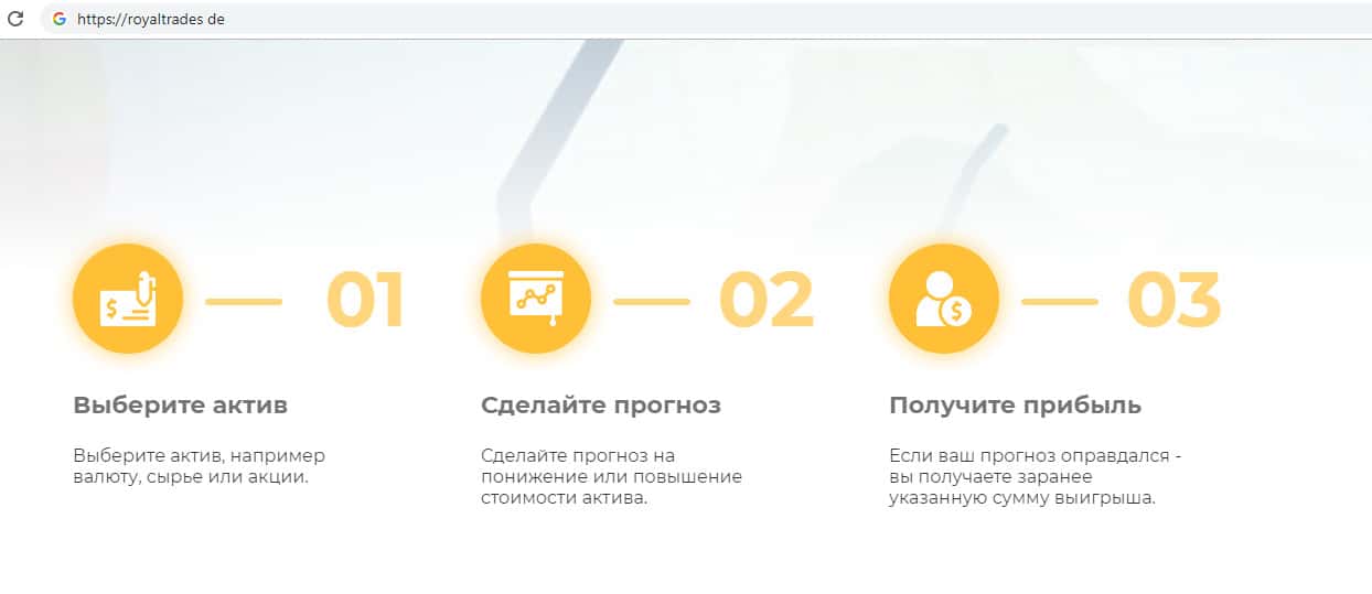 Шуллера компании Роял Трейдс утверждают, что для получения прибыли есть всего три шага к успеху, первый - выбрать актив, второй - сделать прогноз на повышение или понижение стоимости актива и конечно же третий - получить прибыль. Положив свои денежные средства на счет конторы RoyalTrades De не стоит надеяться на то, что Вам вернут их обратно.