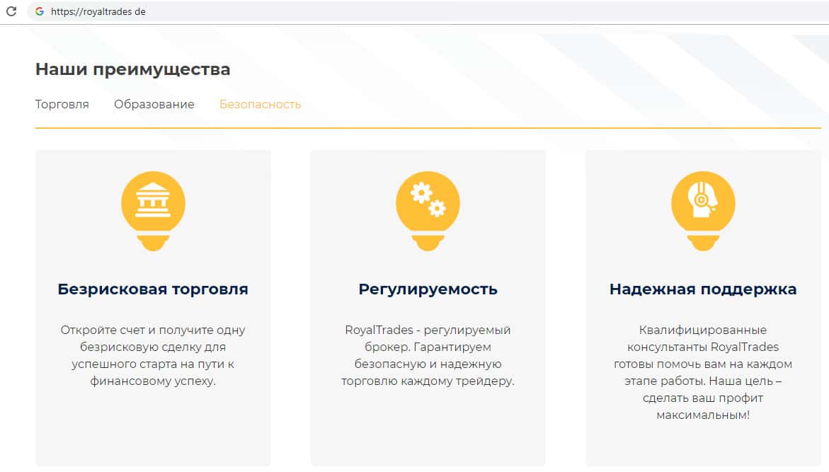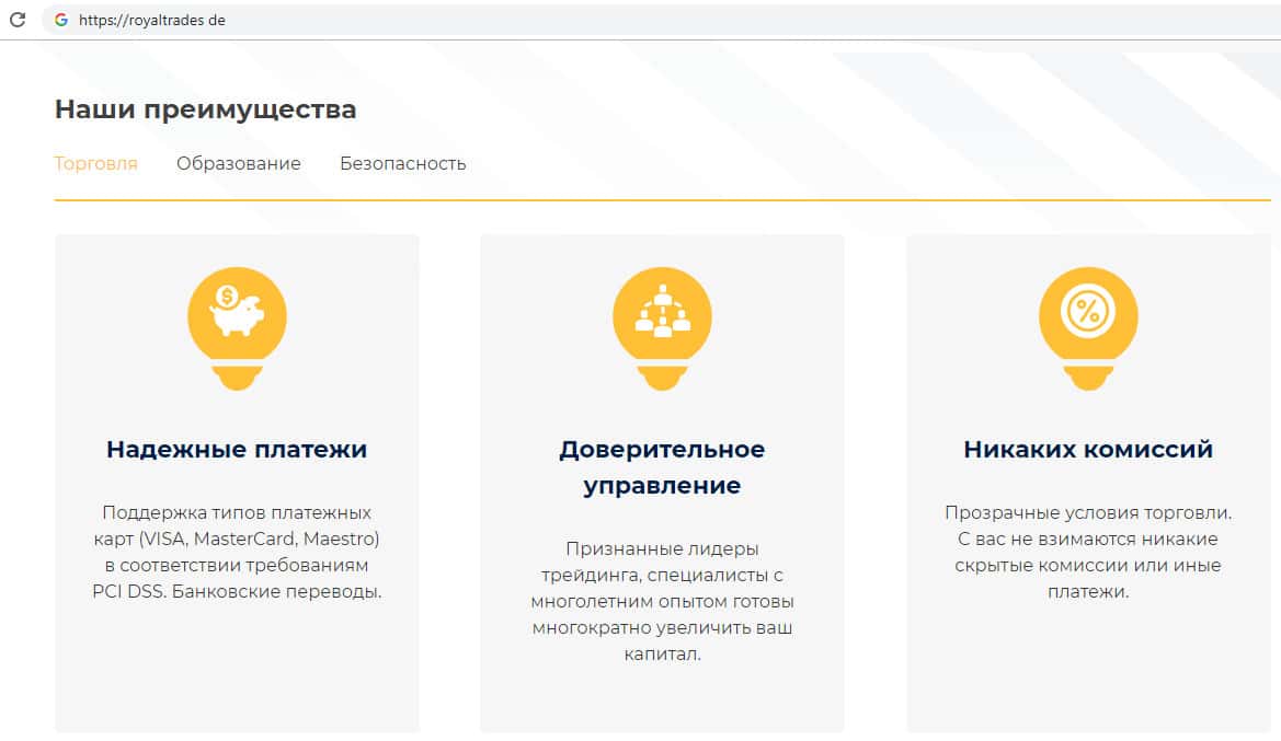 - Придуманные преимущества брокерской компании RoyalTrades De