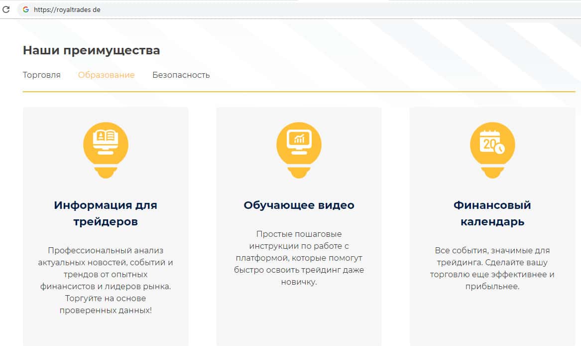 Как и на любом сайте мошенников, шуллера конторы RoyalTrades De отлично постарались и разместили всю необходимую информацию для трейдеров, например финансовый календарь и обучающие видео. Это не означает, что можно доверять данной организации и не дает никакой гарантии надежности брокера Роял Трейдс.