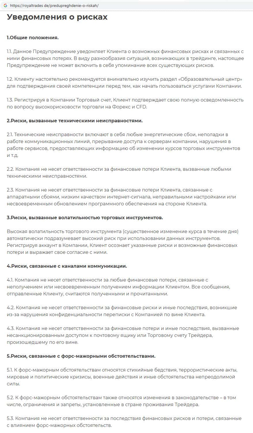 - Уведомление о всевозможных рисках на сайте шараги Роял Трейдс